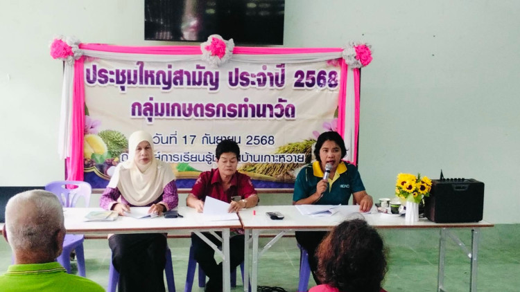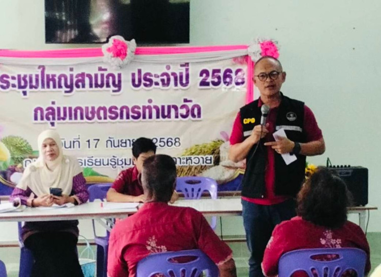 วันที่ 17 กันยายน เวลา 09.00 น. นางสุธาสินี แสงอรุณ สหกรณ์จังหวัดปัตตานี มอบหมายให้นายนิเปาซี เจ๊ะแว ผู้อำนวยการกลุ่มจัดตั้งและส่งเสริมสหกรณ์ นางสาวรอปิอ๊ะ มะมิง ผู้อำนวยการกลุ่มส่งเสริมสหกรณ์ 2 (อำเภอหนองจิก โคกโพธิ์ แม่ลาน ยะรัง) พร้อมด้วยบุคลากรสำนักงานสหกรณ์จังหวัดปัตตานี เข้าร่วมประชุมใหญ่สามัญประจำปี 2568 สำหรับปีบัญชีสิ้นสุดวันที่ 31 พฤษภาคม 2568 ของกลุ่มเกษตรกรทำนาวัด ในการนี้ได้ให้คำแนะนำในเรื่องการแก้ไขเพิ่มเติมข้อบังคับของกลุ่มเกษตรกร บทบาทและอำนาจหน้าที่ของสมาชิก ส่งเสริมการมีส่วนร่วมของสมาชิก แนะนำแนวทางการดำเนินธุรกิจเพื่อให้เกิดผลกำไรเพิ่มขึ้นเพื่อยกระดับชั้นความเข้มแข็งของกลุ่มเกษตรกร แนะนำส่งเสริมการใช้หลักปรัชญาเศรษฐกิจพอเพียงในการดำเนินงาน ส่งเสริมการน้อมนำหลักปรัชญาเศรษฐกิจพอเพียงสู่สมาชิก พร้อมทั้งกำกับ แนะนำ ส่งเสริมให้กลุ่มเกษตรกรดำเนินงานให้เป็นไปตามระเบียบ ข้อบังคับและกฎหมายอื่นที่เกี่ยวข้อง ทั้งนี้ ผลการดำเนินงานกลุ่มเกษตรกรสำหรับปีบัญชีสิ้นสุดวันที่ 31 พฤษภาคม 2568 มีสมาชิกทั้งสิ้น 76 ราย สมาชิกมาประชุม จำนวน 58 ราย มีทุนดำเนินงานทั้งสิ้น จำนวน 1,664,717.78 บาท ทุนเรือนหุ้น 377,790 บาท ทุนสำรอง 578,239.04 บาท มีผลกำไรสุทธิประจำปี 48,042.47 บาท ณ ศูนย์การเรียนรู้ชุมชนบ้านเกาะหวาย ตำบลวัด อำเภอยะรัง จังหวัดปัตตานี