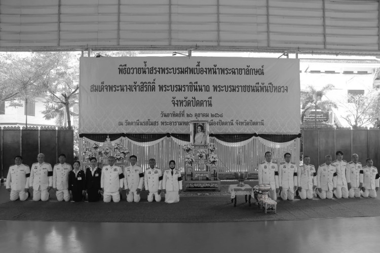 สำหรับพิธีการ นายสนั่น สนธิเมือง รองผู้ว่าราชการจังหวัดปัตตานี ปฏิบัติหน้าที่แทนผู้ว่าราชการจังหวัดจุดธูปเทียนบูชาพระรัตนตรัย ผู้ร่วมพิธียืนสงบนิ่งน้อมรำลึกในพระมหากรุณาธิคุณของพระองค์ท่าน จากนั้น นายสนั่น สนธิเมือง รองผู้ว่าราชการจังหวัดปัตตานี สรงน้ำพระบรมศพเบื้องหน้าพระฉายาลักษณ์ฯ นางพาตีเมาะ สะดียามู ผู้ว่าราชการจังหวัดปัตตานี ลงนามถวายอาลัย และผู้ร่วมในพิธี ร่วมลงนามถวายความอาลัย ตามลำดับ ทั้งนี้ จังหวัดปัตตานีได้จัดให้ประชาชน ร่วมถวายน้ำสรงพระบรมศพสมเด็จพระนางเจ้าสิริกิติ์ พระบรมราชินีนาถ พระราชชนนีพันปีหลวง เบื้องหน้าพระฉายาลักษณ์ และลงนามถวายอาลัย ณ วัดตานีนรสโมสร พระอารามหลวง ในวันที่ 26 ตุลาคม 2568 จนถึงเวลา 16.00 น.