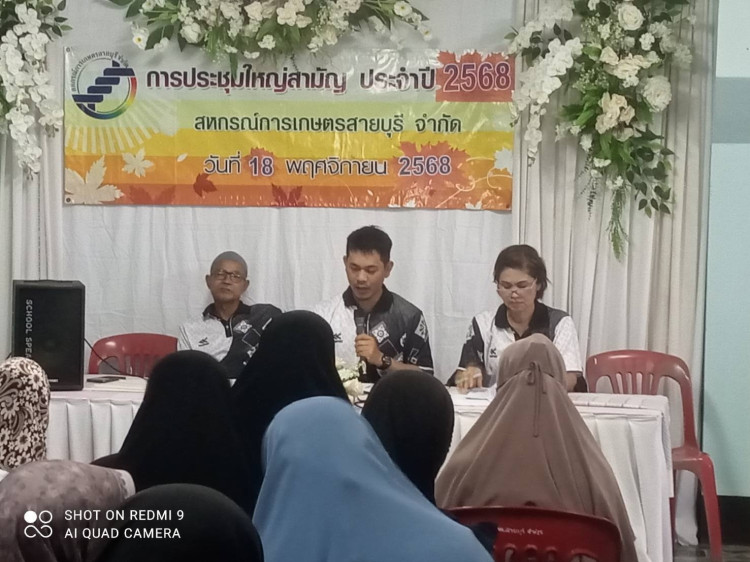 วันที่ 18 พฤศจิกายน 2568 เวลา 09.30 น. นางสุธาสินี แสงอรุณ สหกรณ์จังหวัดปัตตานี มอบหมายให้นางอรยา ศรีแสนยงค์ ผอ.กลุ่มส่งเสริมสหกรณ์ 4 (อำเภอสายบุรี ไม้แก่น กะพ้อ ) เข้าร่วมประชุมใหญ่สามัญประจำปี 2568 สำหรับสิ้นสุดปีบัญชี 30 มิถุนายน 2568 ของสหกรณ์การเกษตรสายบุรี จำกัด ซึ่งได้มีการแนะนำ ส่งเสริมให้มีการประชุมใหญ่สามัญประจำปีให้เป็นไปตามระเบียบวาระ และข้อบังคับของสหกรณ์ฯ พร้อมนี้ได้ขับเคลื่อนการดำเนินงานให้สามารถยกระดับความเข้มแข็งของสหกรณ์ และที่ประชุมใหญ่ได้มีมติเป็นเอกฉันท์กำหนดถือใช้ข้อบังคับของสหกรณ์เพื่อให้สอดคล้องกับกฎกระทรวงกำหนดวัตถุประสงค์และขอบเขตแห่งการดำเนินกิจการของสหกรณ์แต่ละประเภท