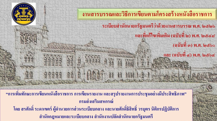 โอกาสนี้ อธิบดีกรมส่งเสริมสหกรณ์ได้กล่าวว่า การฝึกอบรมในครั้งนี้ เป็นการเสริมสร้างทักษะ ความรู้ และความสามารถ ให้แก่บุคลากรกรมส่งเสริมสหกรณ์ ในด้านการเขียนหนังสือราชการ การเขียนรายงาน และสรุปรายงานการประชุม ให้เป็นไปตามมาตรฐานทักษะที่สำนักงาน ก.พ. และกรมส่งเสริมสหกรณ์กำหนด พร้อมทั้งแสดงความคาดหวังว่า ผู้เข้ารับการฝึกอบรมทุกท่านจะสามารถนำความรู้ที่ได้รับ ไปใช้เป็นแนวทางในการปฏิบัติงานได้อย่างถูกต้องเหมาะสม และมีประสิทธิภาพต่อไป