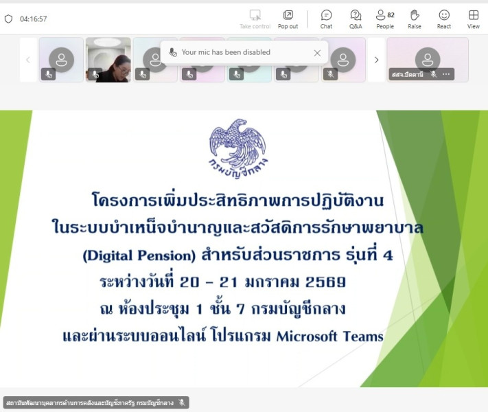 นางสุธาสินี แสงอรุณ สหกรณ์จังหวัดปัตตานี มอบหมายให้นางมุกดา เพชรรัตน์ หัวหน้าฝ่ายบริหารทั่วไป เข้าร่วมโครงการเพิ่มประสิทธภาพการปฏิบัติงานในระบบบำเหน็จบำนาญและสวัสดิการรักษาพยาบาล (Digital Pension) สำหรับส่วนราชการ รุ่นที่ 4 ระหว่างวันที่ 20 - 21 มกราคม 2569 ในรูปแบบ Online ผ่านระบบโปรแกรม Microsoft Teams เพื่อเพิ่มประสิทธิภาพในการปฏิบัติงานของเจ้าหน้าที่ ของส่วนราชการผู้ขอส่วนราชการผู้เบิก และนายทะเบียน ในระบบบำเหน็จบำนาญ ให้มีความรู้ความเข้าใจหลักเกณฑ์ วิธีปฏิบัติงานในระบบ (Digital Pension)